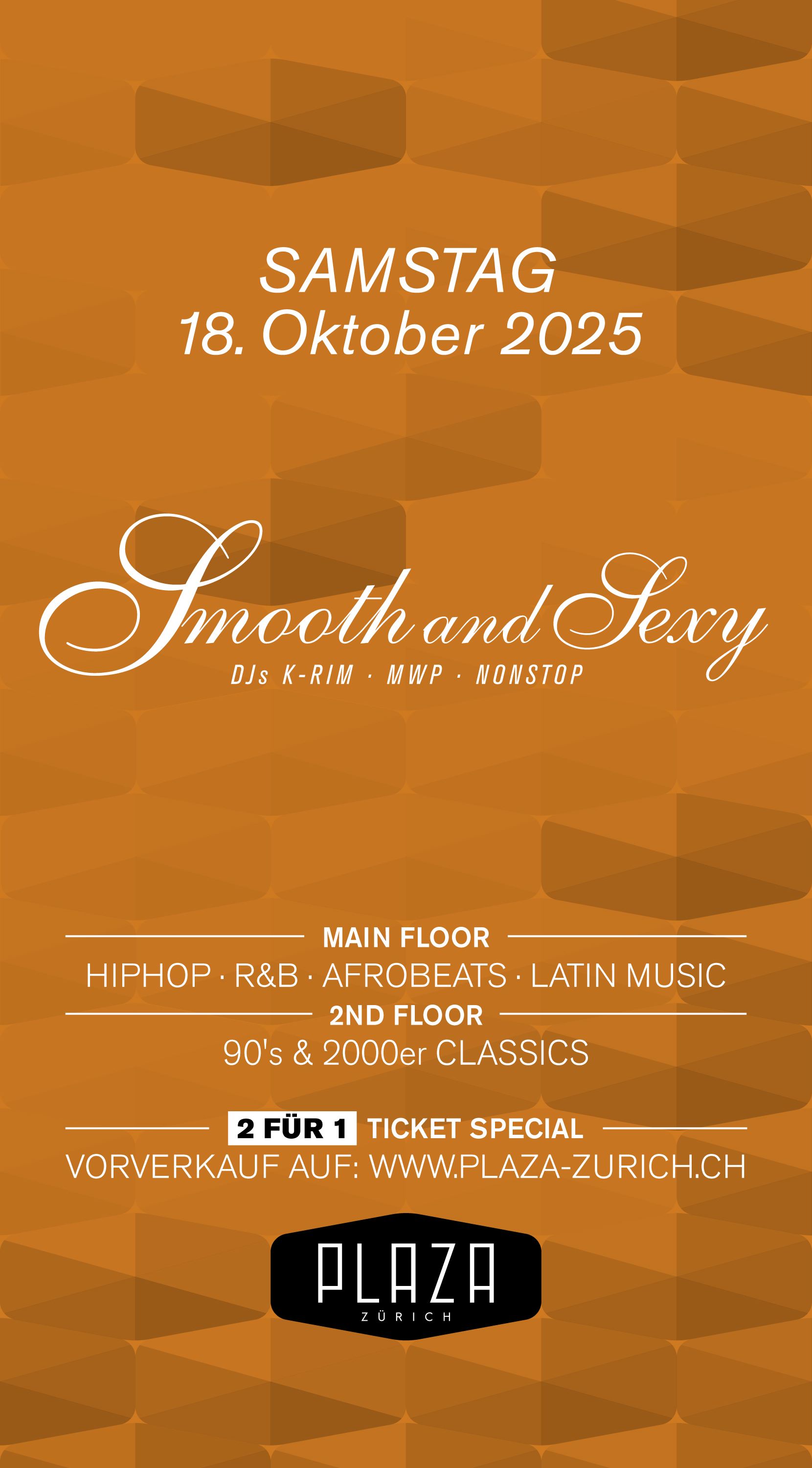 Im Mai geht es mit der Smooth N Sexy natürlich nahtlos im PLAZA Klub weiter und wir freuen uns, euch am angestammten Platz, dem dritten Samstag des Monats, zu begeistern! Die original ladies favourite gehört zu den beliebtesten Partylabels der Stadt und hat mittlerweile Kultstatus erreicht. Dazu beigetragen hat sicherlich auch das DJ-Team bestehend aus K-RIM, Mwp, Nonstop & Oris, welche mit einem phänomenalen Musikmix aus HipHop, R&B, Afrobeats, Dancehall & Latin Music zu überzeugen wissen. In der über 19-jährigen Smooth N Sexy Geschichte konnten wir mittlerweile unzählige positive Erinnerungen schaffen und dafür sagen wir Danke und freuen auf die Nacht des 18. Oktobers 2025, wenn das PLAZA wieder heiss ist und smooth and sexy dazu!