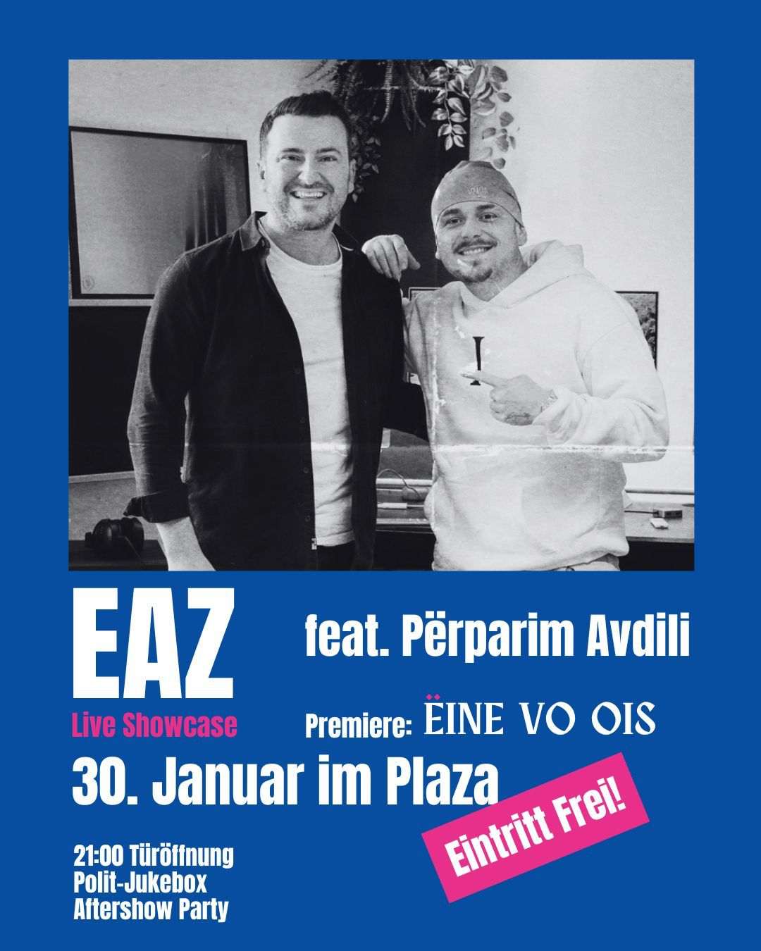 Und performt exklusiv und for free einen 30minütigen Live-Showcase mit all seinen Hits.Höhepunkt der Show ist die Premiere seines neuen Songs «Eine vo ois», den EAZ für den Zürcher Stapi-Kandidaten Përparim Avdili geschrieben hat. Weil ihn dessen Biografie gleichsam inspiriert und an die eigene erinnert.