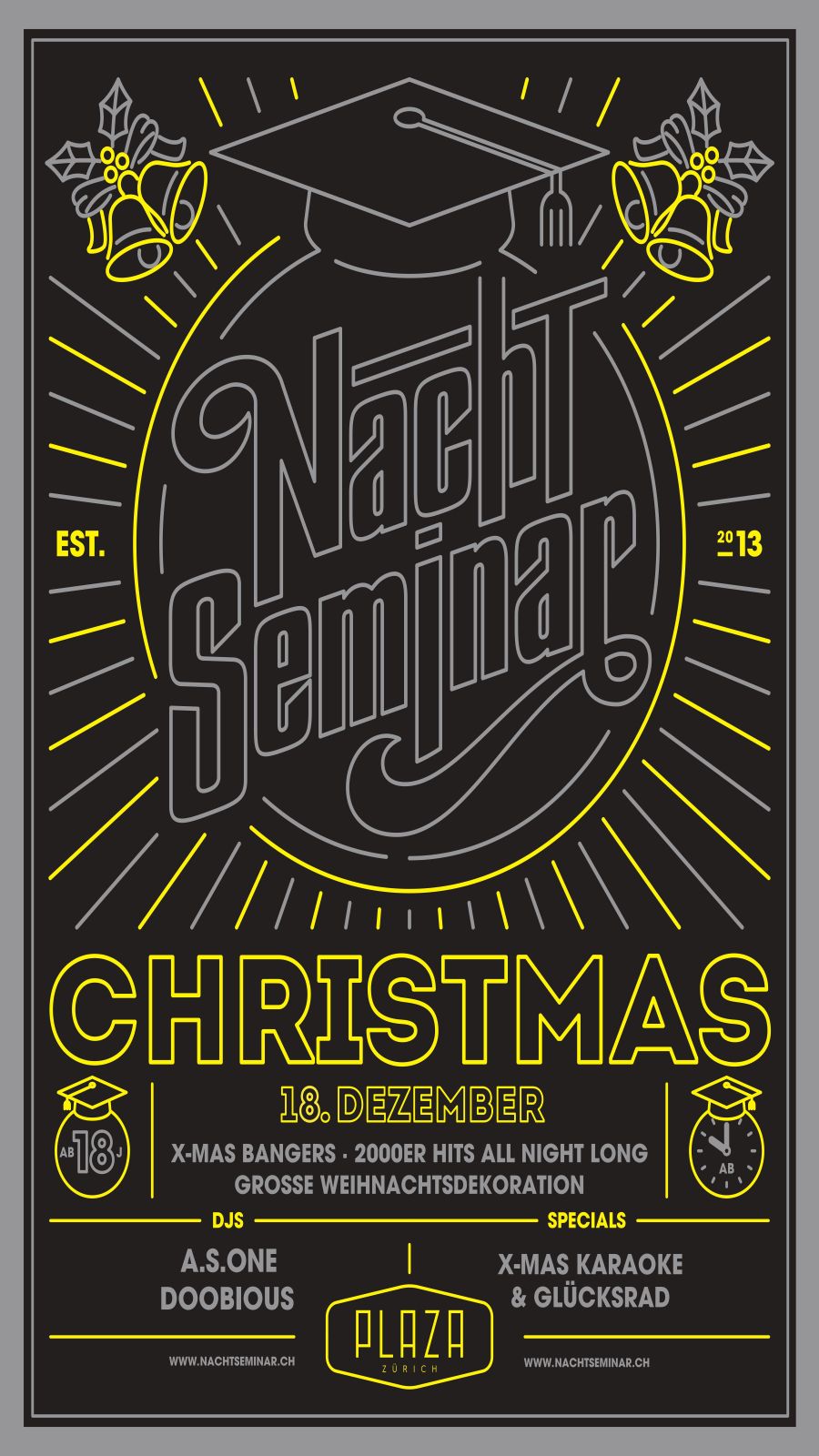Nachdem tagsüber Formeln gebüffelt, Bücher gewälzt, diverse Vorträge gehalten wurden und die Köpfe geraucht haben, kommt unser Nachtseminar wie gerufen. Das Plaza bietet die ideale Plattform, sich nach der Uni in gepflegtem Rahmen zu treffen und auszutauschen. Die ordentliche Festerei kommt dabei nicht zu kurz. Faire Preise an der Bar und das Hosting von verschiedenen führenden Studentenverbänden der Universität und ETH Zürich sorgen dafür, dass sich Studenten und auch solche, die es nicht sind, näher kommen. Und die verschiedenen Specials wie Glücksrad, Beerpong, Photobooth und viele mehr bringen für jeden Besucher die ideale Unterhaltung.