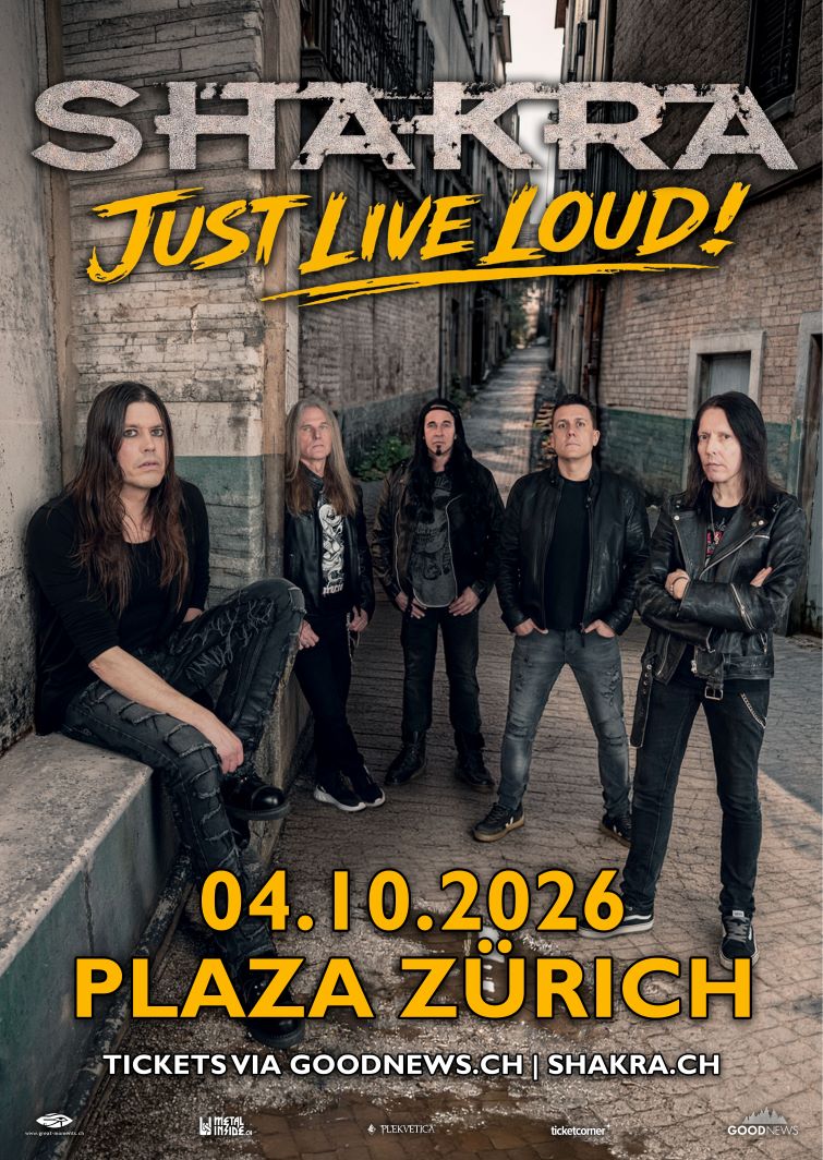 Abendkasse: CHF 55.- (ohne Gewähr!)Am Sonntag, 04. Oktober 2026 bringt die Schweizer Rockformation Shakra ihr neues Album Just Live Loud ins Plaza Zürich – und verwandelt den Club in einen Ort, an dem Energie und Leidenschaft aufeinandertreffen.