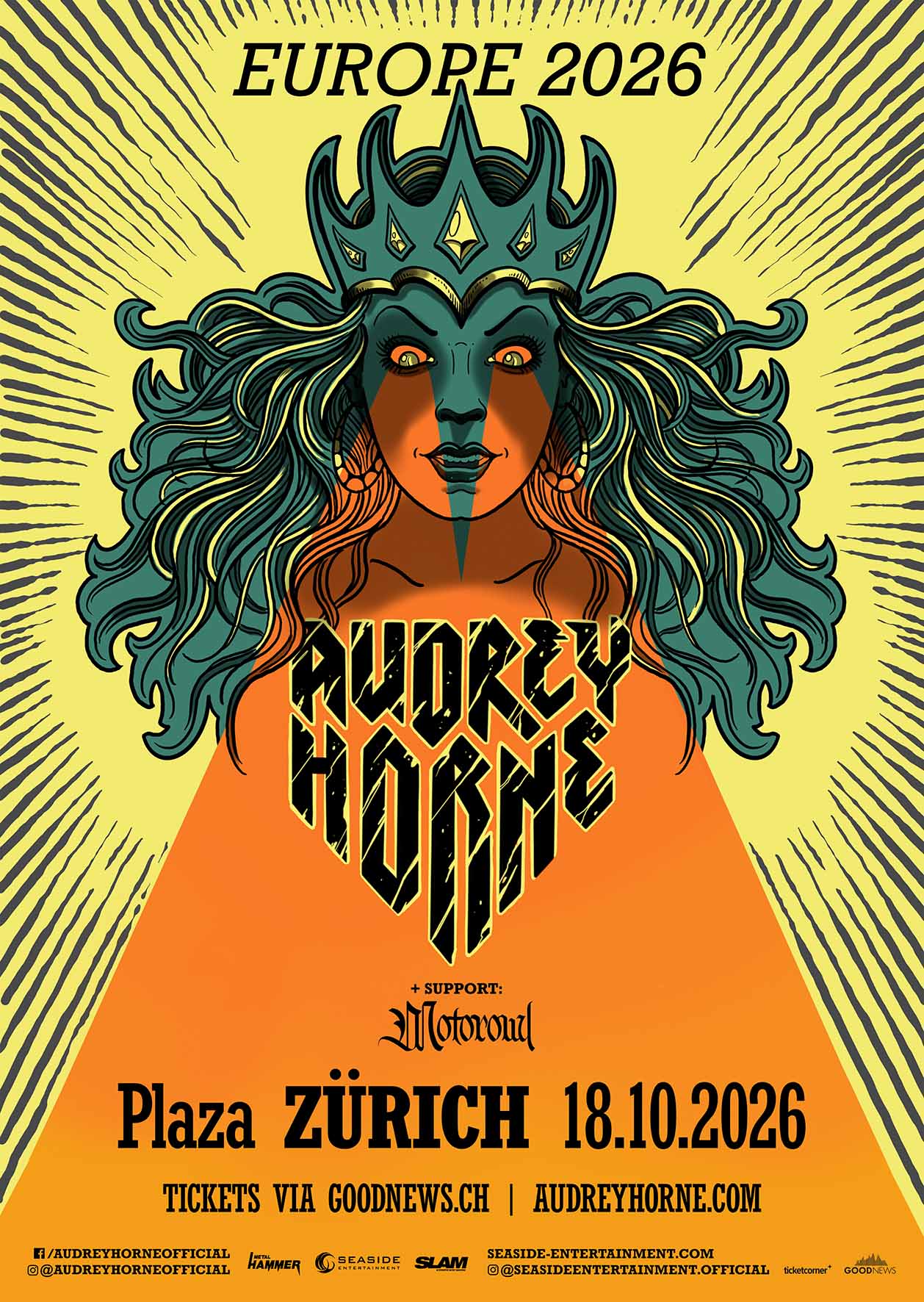 Twin-Guitars & Stadion-Hymnen: Audrey Horne bringen am Sonntag, 18. Oktober 2026 den Classic Rock zurück nach Zürich ins Plaza!Wer behauptet, der Geist des echten Hard Rocks sei in den 80ern hängengeblieben, hat die Rechnung ohne Audrey Horne gemacht. Am 18. Oktober 2026 verwandelt die norwegische Energie-Maschine das Plaza in einen Hexenkessel für alle, die mit dem Sound von Iron Maiden, Van Halen und Kiss aufgewachsen sind.
