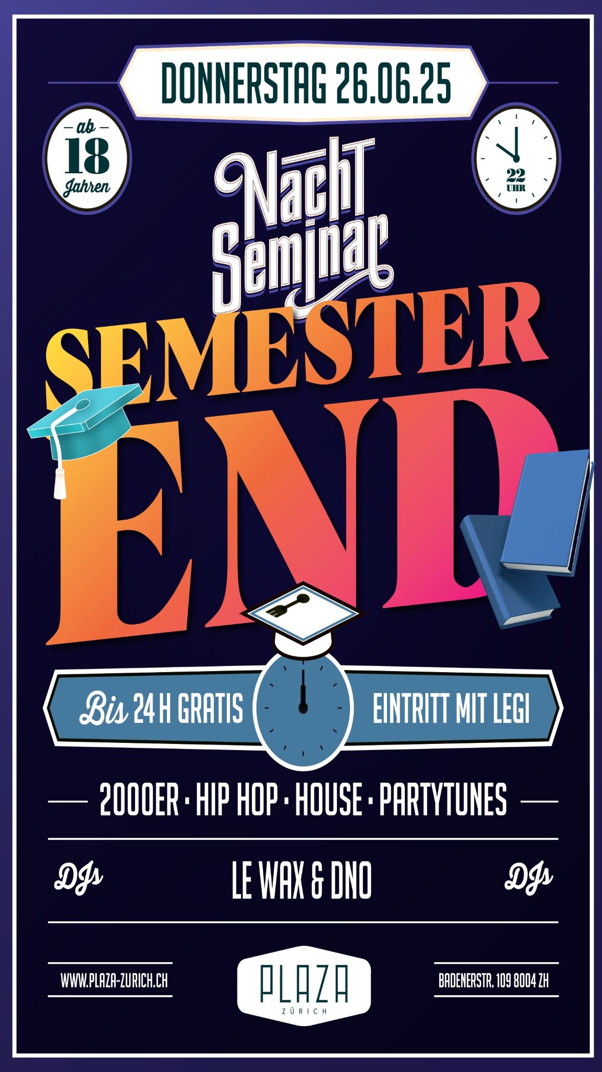 Nachdem tagsüber Formeln gebüffelt, Bücher gewälzt, diverse Vorträge gehalten wurden und die Köpfe geraucht haben, kommt unser Nachtseminar wie gerufen. Das Plaza bietet die ideale Plattform, sich nach der Uni in gepflegtem Rahmen zu treffen und auszutauschen. Die ordentliche Festerei kommt dabei nicht zu kurz. Faire Preise an der Bar und das Hosting von verschiedenen führenden Studentenverbänden der Universität und ETH Zürich sorgen dafür, dass sich Studenten und auch solche, die es nicht sind, näher kommen. Und die verschiedenen Specials wie Glücksrad, Beerpong, Photobooth und viele mehr bringen für jeden Besucher die ideale Unterhaltung.