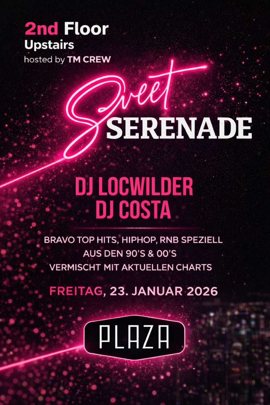 Am Freitag, 23.01.2026 hosten wir (TM CREW) den 2nd Floor (upstairs) im PLAZA Klub Zürich. Zusammen mit unseren Freunden von RESTLEZZ heisst es an besagtem Abend: Sweet Serenade meets Plaze to be!