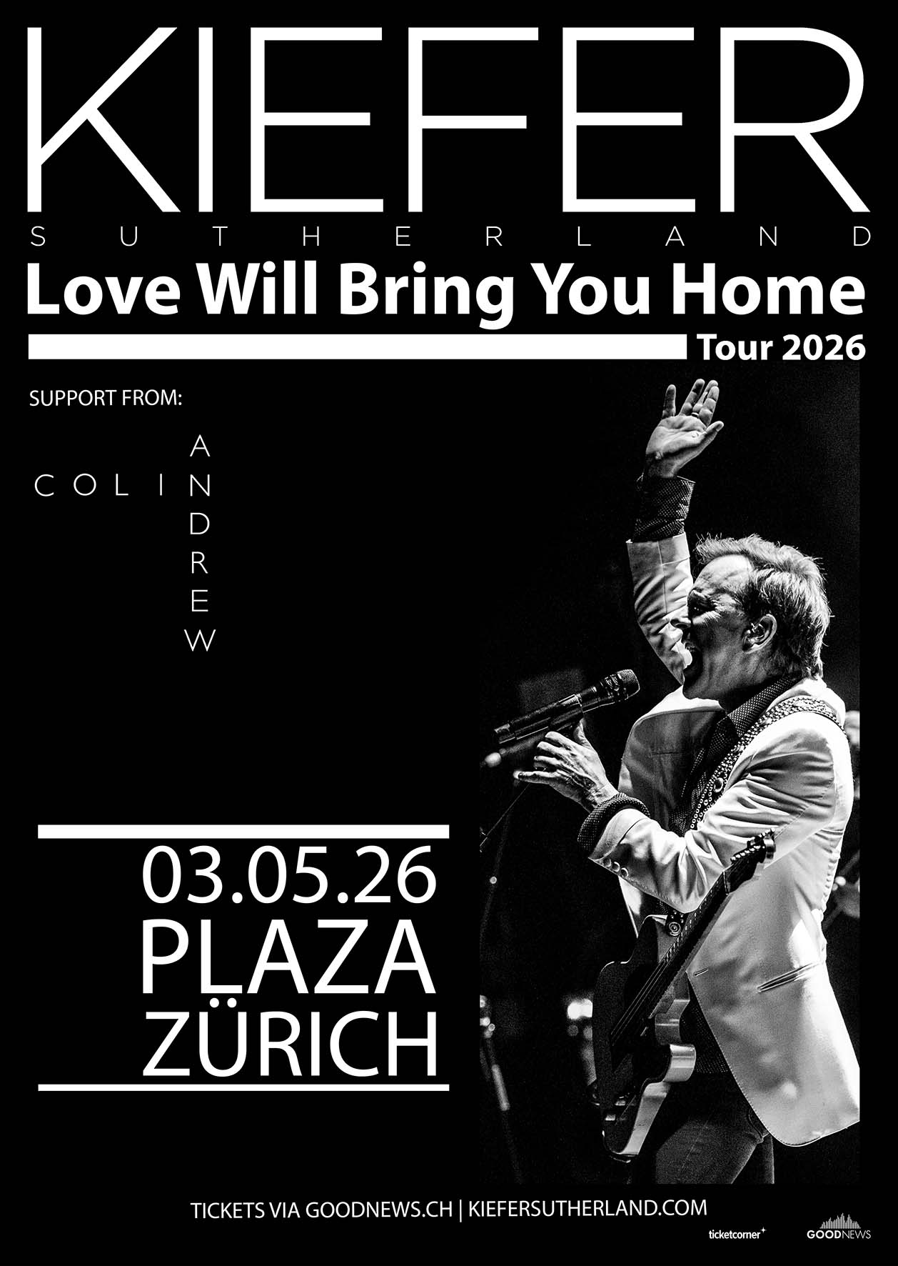 Am Sonntag, 03. Mai 2026 tauscht Hollywood-Star Kiefer Sutherland das Filmset gegen die Konzertbühne und macht mit seiner Love Will Bring You Home Tour Halt im Plaza Zürich. Gemeinsam mit seiner Band präsentiert er einen Abend voller authentischer Country-Klänge. Kiefer Sutherland gilt seit Jahrzehnten als einer der renommiertesten Schauspieler Hollywoods. Seit über vierzig Jahren ist er im Showbusiness tätig und prägte mit Rollen in Filmen wie Stand By Me, The Lost Boys, Young Guns, Dark City, A Time to Kill oder Melancholia ganze Generationen von Kinogänger:innen. Auch im Fernsehen feierte er grosse Erfolge, unter anderem als Hauptdarsteller der Serien 24, Designated Survivor und Rabbit Hole. Neben seiner Schauspielkarriere widmet sich Kiefer Sutherland mit grosser Leidenschaft der Musik. Mit den Alben Down In A Hole, Reckless & Me und Bloor Street brachte er seine Liebe zum Country auf die Bühne und spielte über 600 Konzerte weltweit – darunter ausverkaufte Shows und gefeierte Festivalauftritte in Europa. Seine Songs sind tief in der amerikanischen Country-Kultur verwurzelt, die Sutherland auch abseits der Bühne lebt, etwa als Rodeo-Reiter und Betreiber einer Rinderfarm in Kalifornien. Das Konzert in der Plaza Zürich bietet die Gelegenheit, Kiefer Sutherland von seiner persönlichen und musikalischen Seite zu erleben. Ein Abend mit ehrlicher, handgemachter Musik, sommerlichen Country-Vibes und einem Künstler, der Geschichten erzählt – nicht nur vor der Kamera, sondern auch auf der Bühne.Ab 16 Jahren