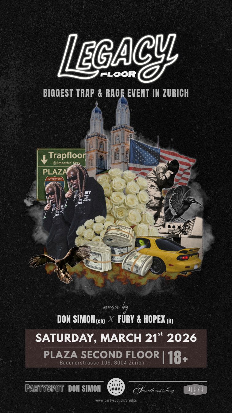 Nach einer grossartigen ersten Ausgabe der LEGACY geht es am Samstag, 21. März 2026, in die nächste Runde. LEGACY übernimmt zum zweiten Mal den Second Floor der Smooth and Sexy im Plaza Klub Zürich. Bekannte Location, bekanntes Spielfeld, gleiche Mission: komplette Eskalation. LEGACY findet weiterhin als grösste Trap & Rage Party von Zürich statt, mit derselben brutalen Energy, kompromisslosen Moshpits und einer Crowd, die keine Grenzen kennt. Trap only. Keine Abstriche. Versprochen. This is not just another party. This is the next level of LEGACY. Zürich, are you ready to rage again?